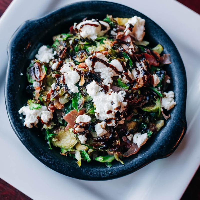 Charred shredded sprouts, prosciutto, goat cheese, balsamic glaze